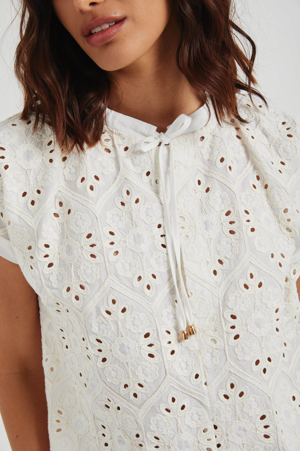 Blusa bordada manga corta con botones y tiras para cuello regulable.